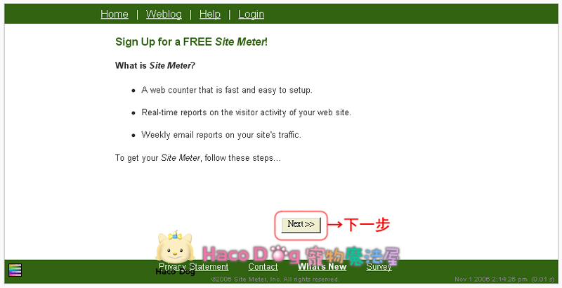 Site Meter 計數器,有人數統計,追蹤每一位觀看部落格的訪客,頁面瀏覽統計,付費會員可享有更多的功能,不過在我們一般的網頁上,免費的功能就足夠了。