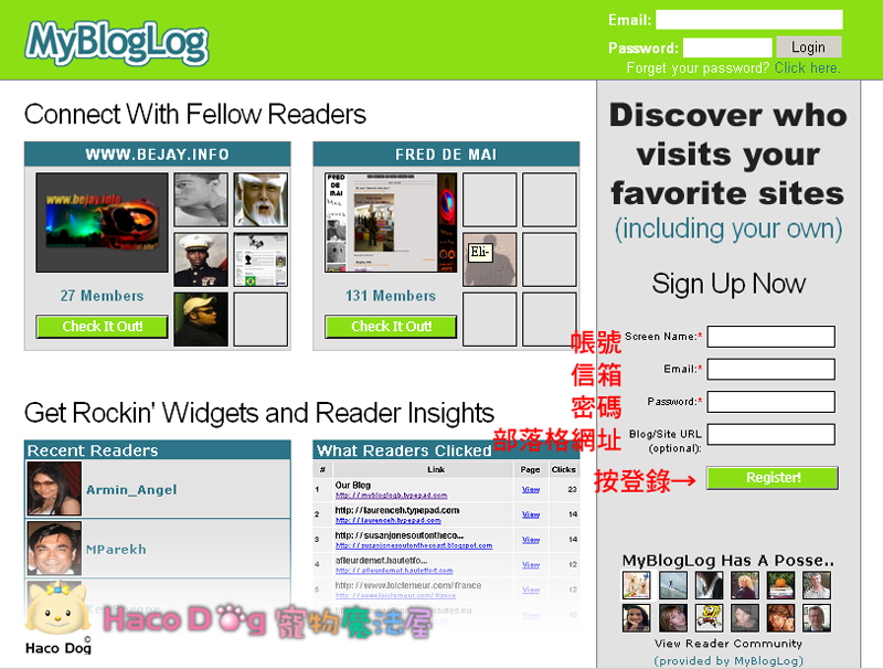 MyBlogLog 這個計數器對想知道訪客從哪裡來的,還有訪客對部落格內容裡提供的哪些連結有興趣,MyBlogLog 的計數器提供的是一週內每天的點閱數,申請註冊請照以下圖示申請。點圖放大 圖(1)圖(2) haco 發表在 痞客邦 留言(1) 人氣(411)